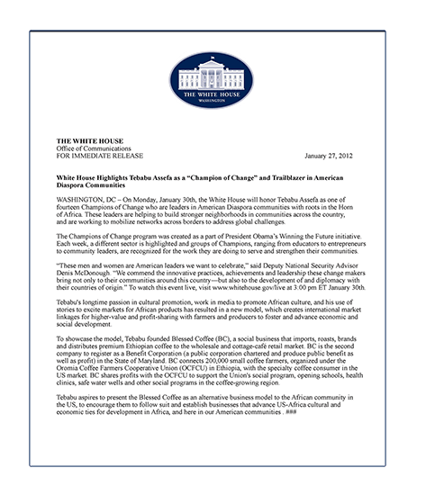 The inauguration of Blessed Coffee, the first community-based business. The event took place at the Gazebo in Old Town Takoma on September 16, 2011, featuring traditional Ethiopian music and a coffee ceremony.